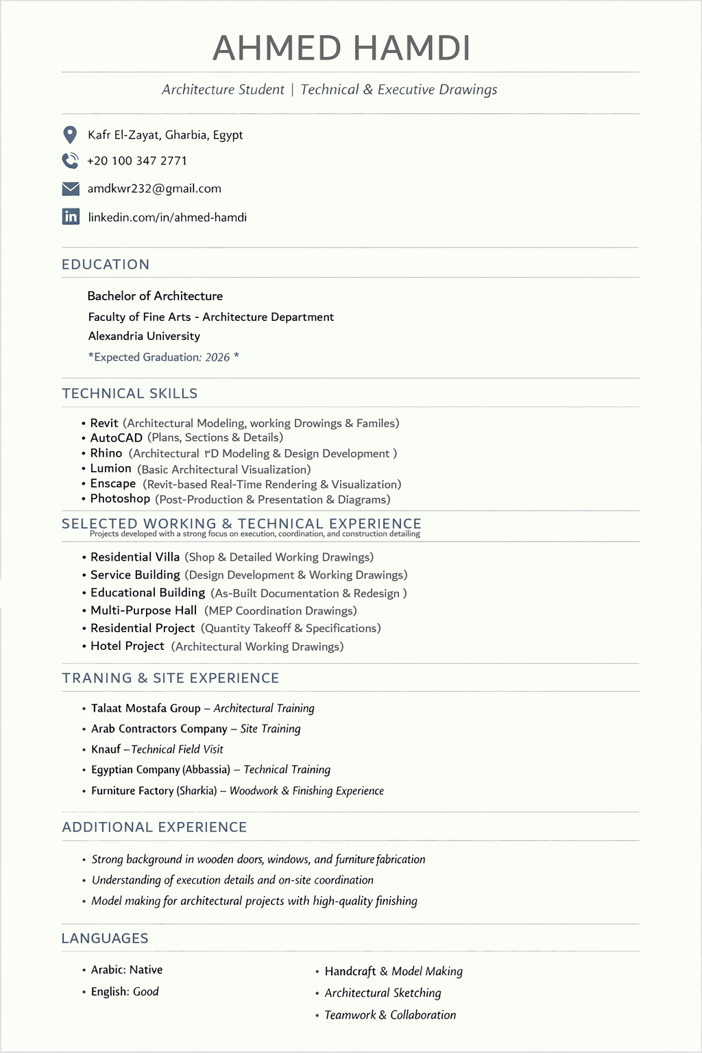 مصمم معماري متخصص في إعداد النماذج ثلاثية الأبعاد والمخططات التنفيذية المتكاملة، مع اهتمام كبير بدقة التفاصيل وقابلية التنفيذ على أرض الواقع.
