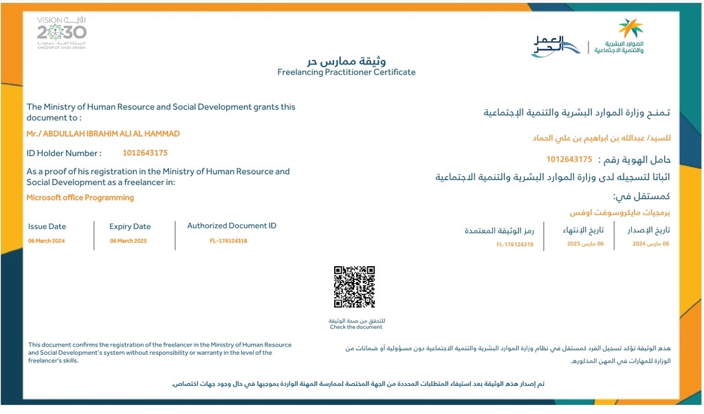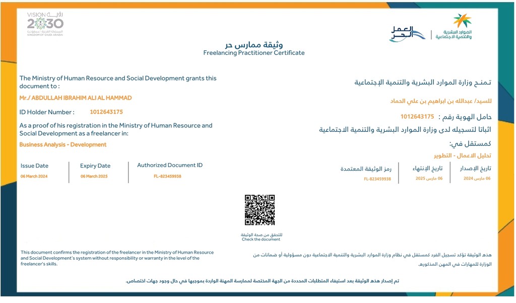 أنا عبدالله إبراهيم، أقدم خبرة متكاملة تمنحني القدرة على إدارة العمليات بكفاءة عالية وضمان جودة الأداء في المشاريع والمؤسسات، والتي تجمع بين: