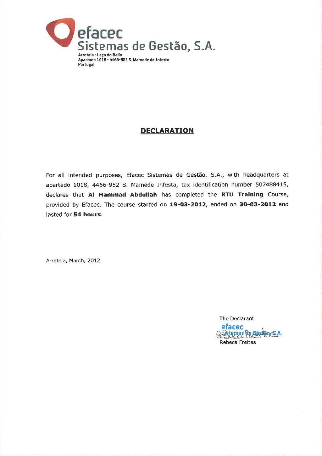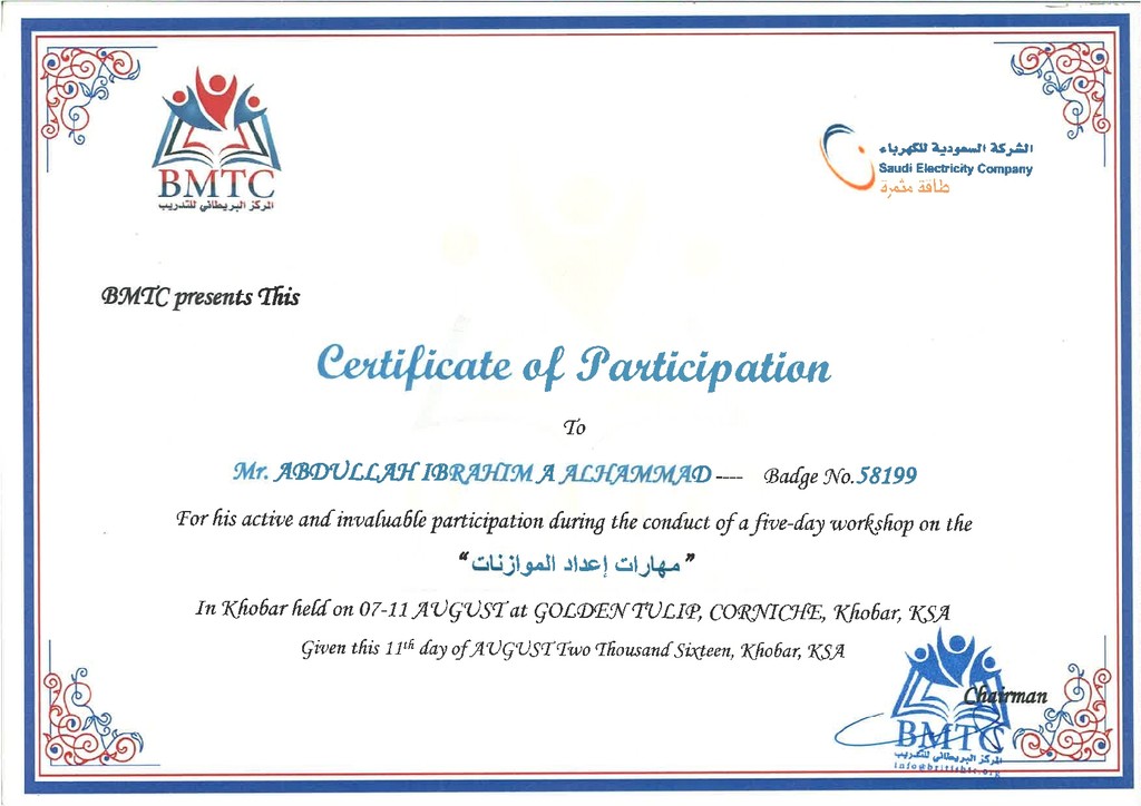 كما شاركت في برامج تدريبية متقدمة كثيرة شملت (التقنية والإدارية) وغيرها، منها: إدارة المشاريع، متابعة وتحليل مؤشرات الأداء KPI، التحسين المستمر، تهيئة وصيانة وحدات طرفية عن بُعد (RTU) Remote Terminal Unit كثيرة ومتنوعة، دقة القراءات التناظرية.. وغيرها الكثير.