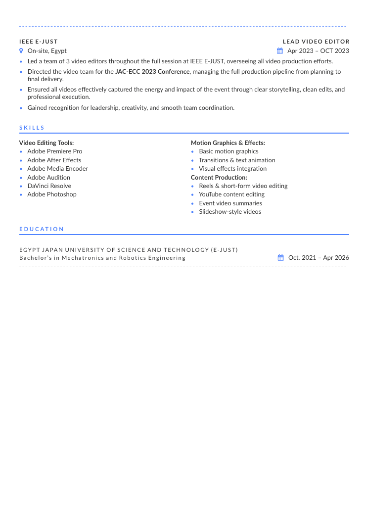 ◼️ خبرة في المونتاج باستخدام Adobe Premiere Pro, After Effects, Audition, Photoshop, DaVinci Resolve.