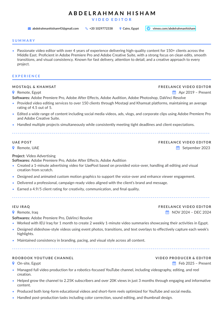 عملت مع شركات وجهات إقليمية ومحلية داخل وخارج الوطن العربي، وقدمت أكثر من 150 مشروع ناجح في مجالات متنوعة مثل: البروموهات الدعائية، فيديوهات السوشيال ميديا، والإعلانات بجميع اللهجات العربية.