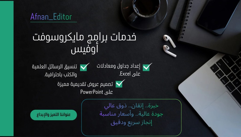 تصميم بوسترات إعلانية وعروض بوربوينت لجهات مختلفة باستخدام أدوات التصميم الحديثة، مع التركيز على إيصال الفكرة بوضوح وجذب الفئة المستهدفة.