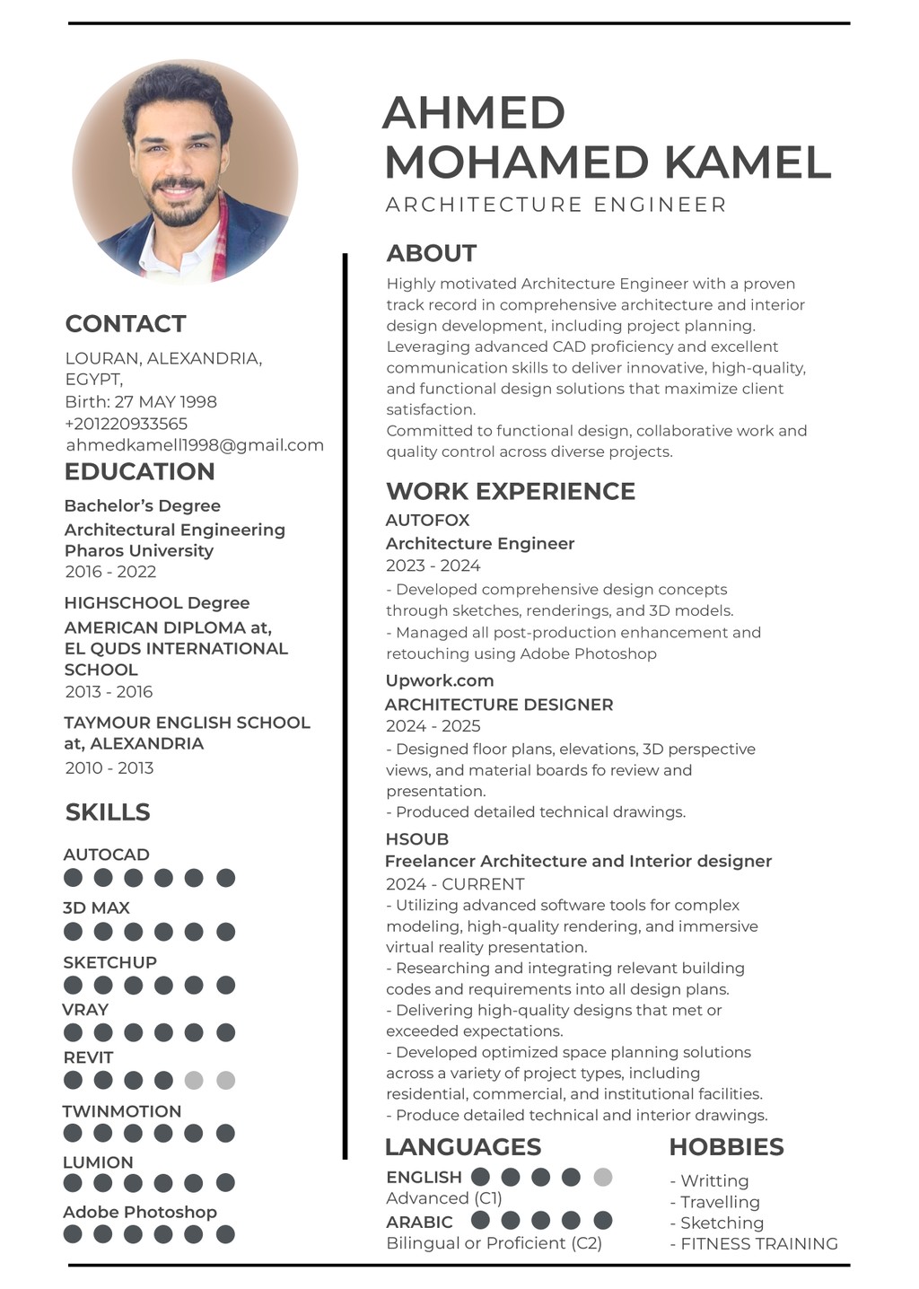أنا احمد مهندس معماري من جمهورية مصر العربية خبره سنوات في التصميم و التنفيذ و العمل الحر, متخصص في التصميم 3d و التخطيط