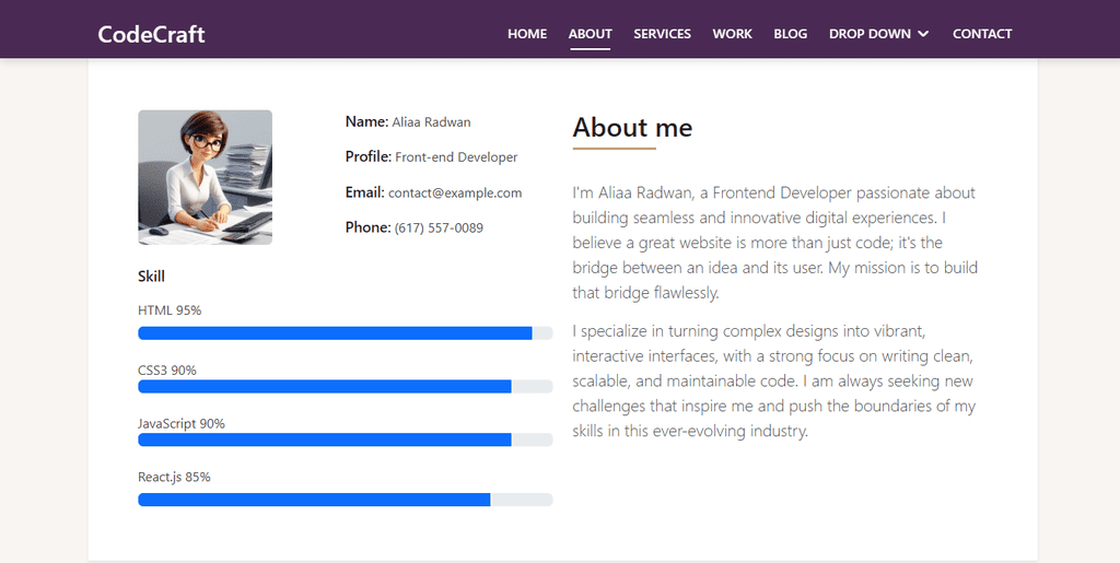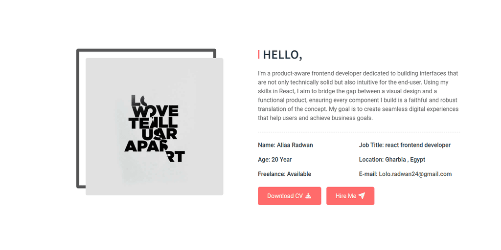 أنا مطوّرة واجهات أمامية شغوفة بتصميم المواقع وتجربة المستخدم، متخصصة في إنشاء صفحات هبوط (Landing Pages)، وبورتفوليوهات شخصية، وسير ذاتية احترافية سواء كمواقع تفاعلية أو تصميمات جاهزة.
