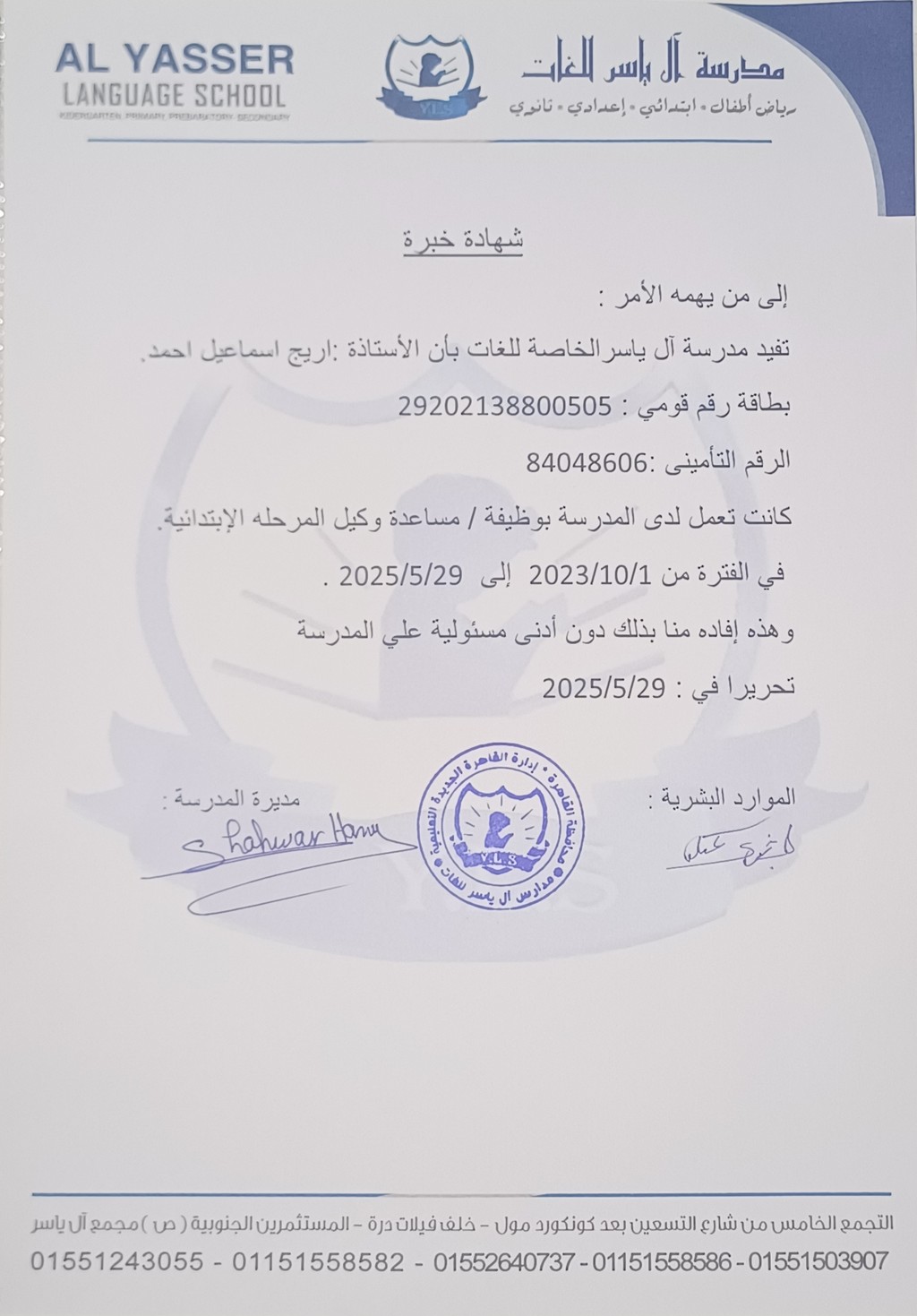 سبتمبر 2023 - مايو 2025 : نائبة مديرة المرحلة الابتدائية بمدرسة آل ياسر الخاصة للغات