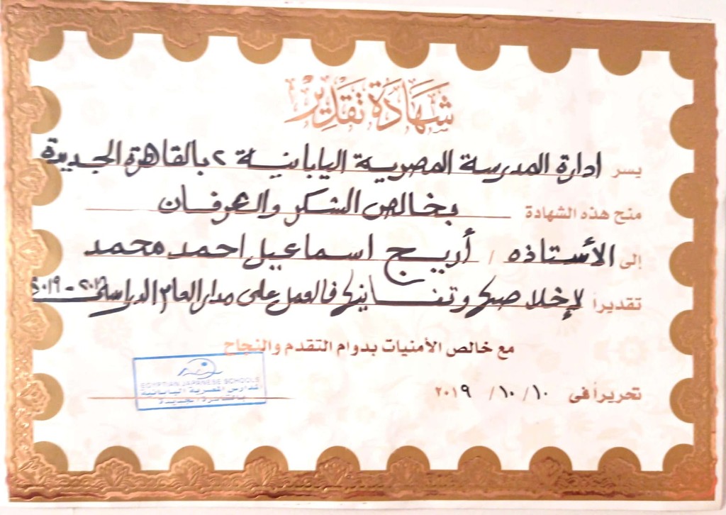 سبتمبر 2018سبتمبر 2019: معلمة بالمدرسة المصرية اليابانية بالقاهرة الجديدة ٢