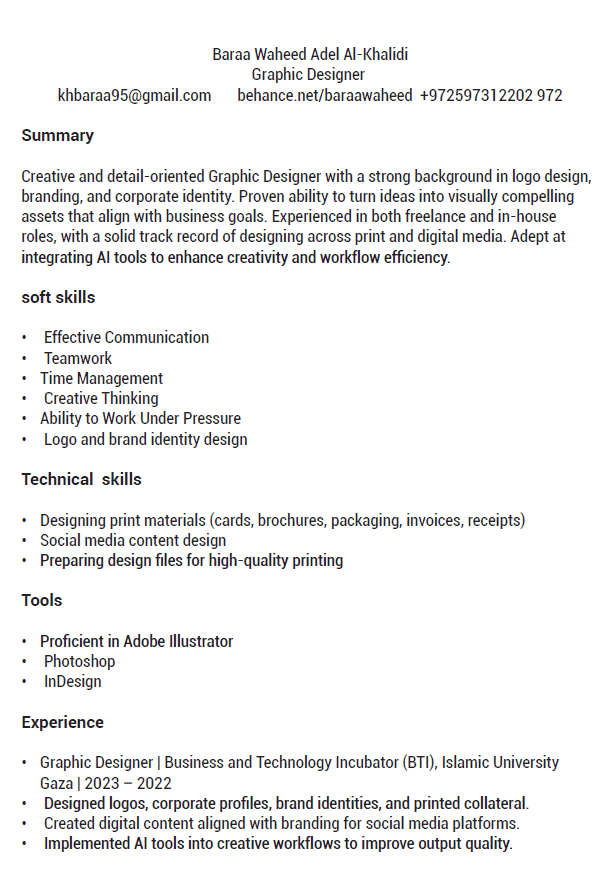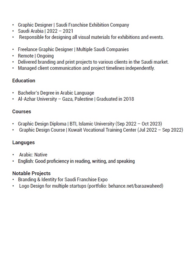 أنا براء، مصممة جرافيك متخصصة في تصميم الشعارات، بناء الهويات البصرية، المطبوعات، وتصاميم السوشيال ميديا. أساعد العلامات التجارية على الظهور بهوية قوية، متقنة، وتعبر عن رسالتها بوضوح وأناقة.