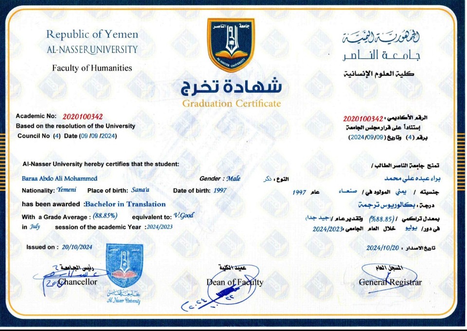 حاصل على درجة البكالوريوس في الترجمة من جامعة الناصر (2020-2024). وتشمل مهاراتي المتميزة التواصل والإقناع، حيث أتحدث الإنجليزية بطلاقة ولدي قدرة مثبتة على تقديم المعلومات بوضوح. كما أتمتع بمهارات تنظيمية فائقة وإدارة بيانات دقيقة، بالإضافة إلى كفاءة تقنية في استخدام أنظمة الكمبيوتر والتطبيقات البرمجية المختلفة. معروف بكوني شخصاً ذا دوافع ذاتية ويعتمد عليه، مع التزام واضح بتحقيق الأهداف اليومية والعمل المستقل. وامتلك أيضاً خبرة قيمة في التواصل بين الثقافات، مما يعزز من قدراتي الإقناعية في التفاعل مع جماهير متنوعة. أتحدث بطلاقة اللغتين العربية (لغة الأم) والإنجليزية، بالإضافة إلى مستوى جيد في اللغة الصينية.