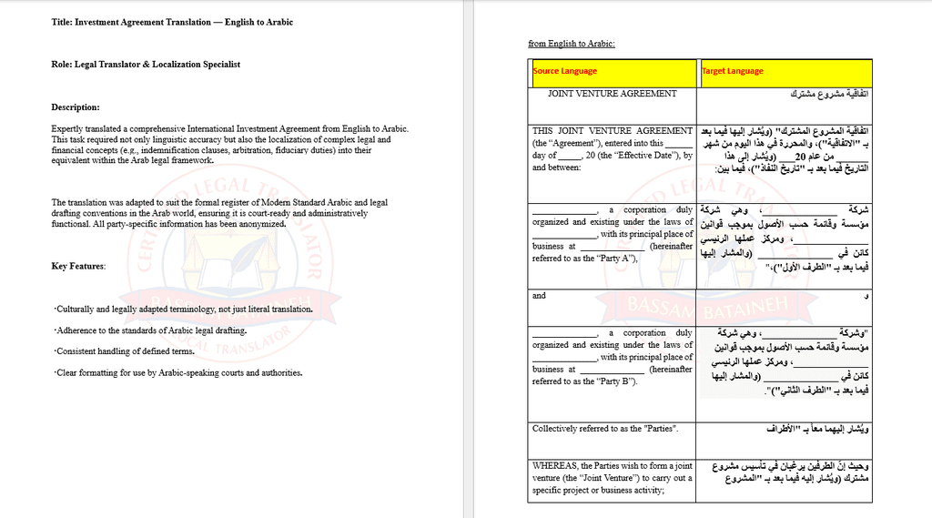 مسؤول عن ترجمة الوثائق القانونية والرسمية والتجارية بين اللغتين العربية والإنجليزية بدقة عالية، مع الالتزام بالمصطلحات القانونية المعتمدة وصياغة النصوص بأسلوب قانوني سليم. أُشرف على مراجعة الترجمات والتدقيق اللغوي قبل التسليم لضمان الجودة والاتساق. أتعامل مع عقود، أحكام قضائية، شهادات رسمية، واتفاقيات متنوعة، مع الحفاظ التام على السرّية والمواعيد الزمنية المحددة.