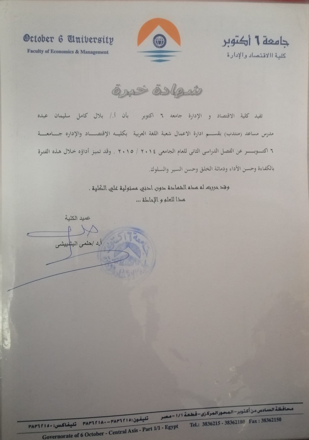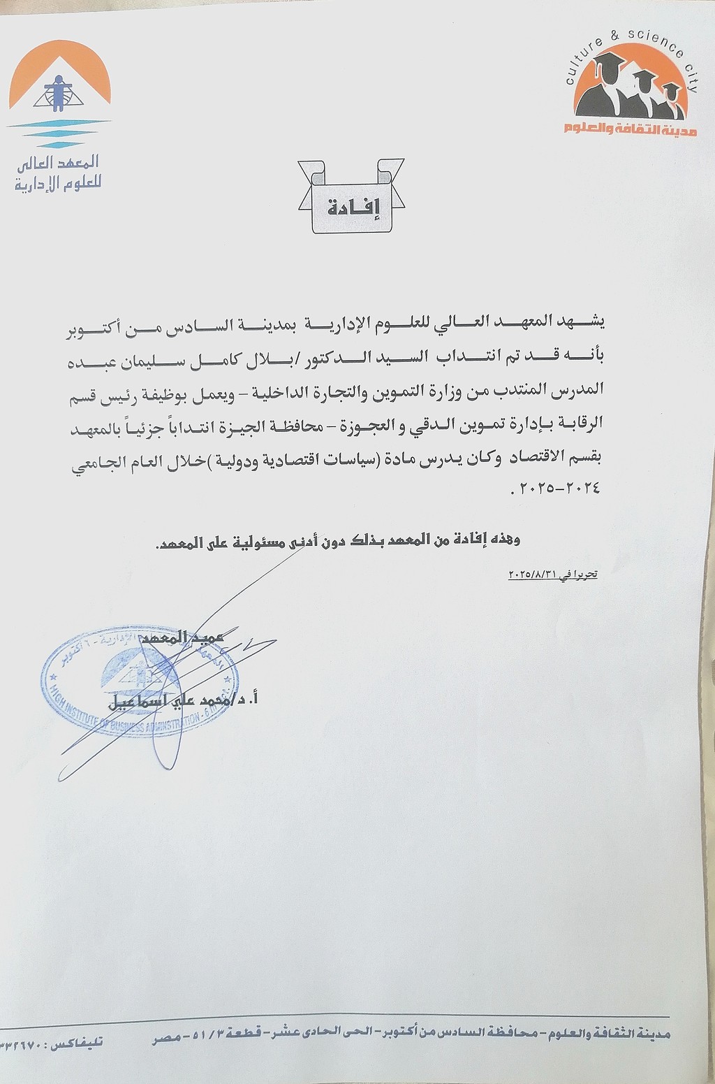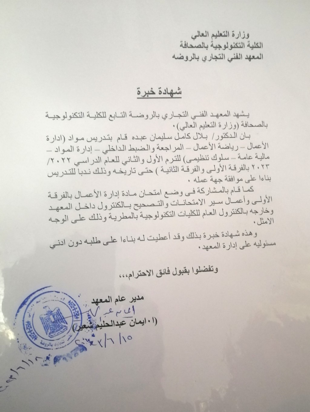 قام بتدريس المواد التالية :سلوك تنظيمى – ادارة مالية – محاسبة مالية – والمشاركة فى وضع امتحانات المواد السابقة وتنظيم اعمال الكنترول والامتحانات فى المعهد