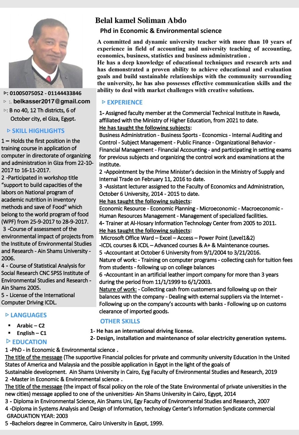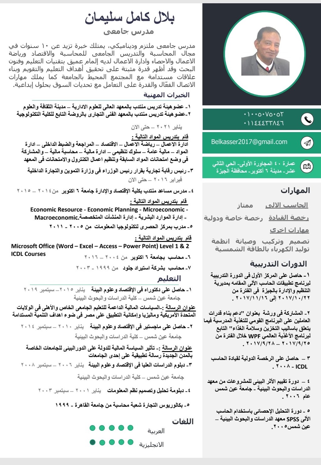 • أتمتع بخبرة واسعة في التدريس الجامعي، حيث قمت بتدريس مجموعة متنوعة من المواد في إدارة الأعمال والاقتصاد والمحاسبة.