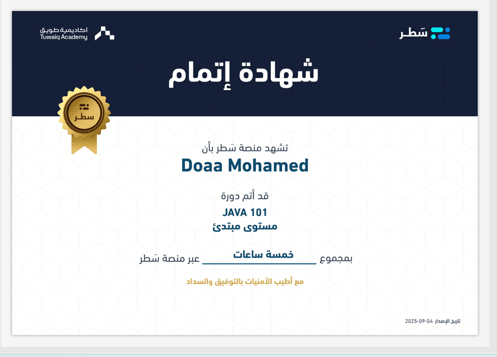 أنا مُختبرة برمجيات طموحة وتهتم بالتفاصيل، أمتلك أساس قوي في الاختبار اليدوي مع معرفة مبدئية بأدوات الأتمتة مثل Selenium. أستعد حاليًا لدخول سوق العمل بهدف المساهمة في تحسين جودة البرمجيات وتجربة المستخدم.