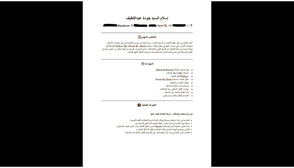 تحليل وتنظيف البيانات – Excel المتقدم – Power BI – SQL – Python – إعداد التقارير المالية – تصميم لوحات البيانات – التواصل وإدارة المهام.