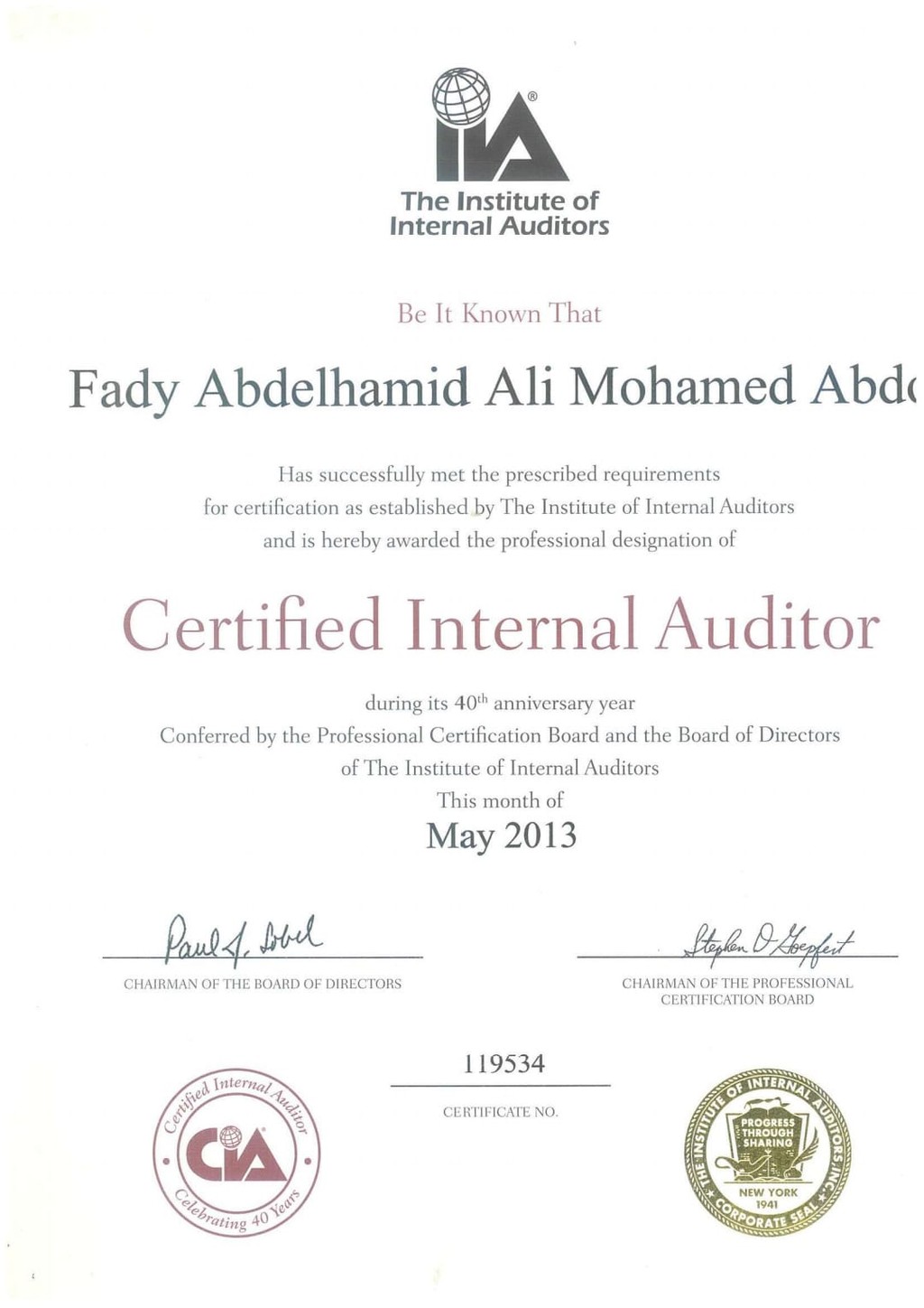 شهادة مهنية معترف بها عالميًا في مجال المراجعة الداخلية، أكسبتني خبرة متقدمة في تصميم أنظمة الرقابة المالية وتحليل المخاطر وضمان الالتزام.