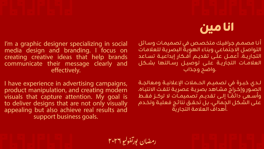 مهتم بمجال التصميم الجرافيكي والسوشيال ميديا، مع خبرة عملية في تصميم المنشورات، الكاروسيلات، والتقارير البصرية