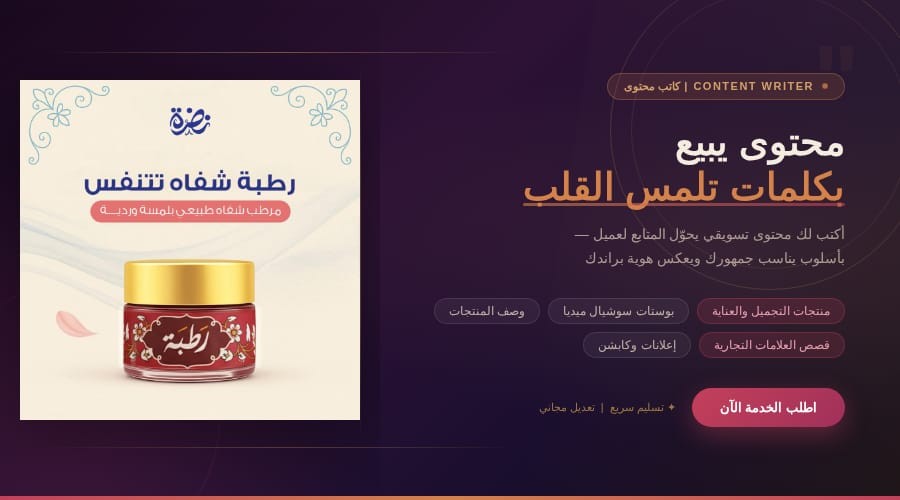 أما في مجال التجميل والعناية بالبشرة (Skin Care)، فلدي شغف ومعرفة تمكنني من فهم غريزة المرأة وحبها الفطري للزينة والتجمل. أستطيع ربط هذه الرغبة الطبيعية بمنتجاتك، من خلال نصوص تخاطب عاطفة العناية بالذات وتخلق حاجة ملحة ومبررة للشراء، بأسلوب يُظهر القيمة الحقيقية للمنتج ويفكك أي مخاوف.
