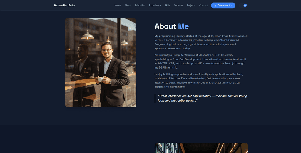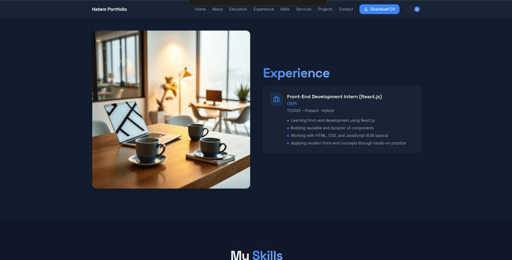 حاليًا أتدرب ضمن برنامج DEPI لتطوير الواجهات الأمامية، حيث أعمل على تطوير مكونات تفاعلية قابلة لإعادة الاستخدام، وتطبيق أفضل الممارسات الحديثة في كتابة الكود وتنظيم المشاريع.