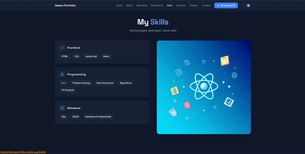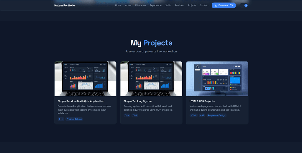 أمتلك أساسًا قويًا في البرمجة وحل المشكلات، مما يساعدني على التفكير بطريقة عملية ومنظمة عند تنفيذ أي مشروع. أهتم بالتفاصيل الصغيرة التي تصنع الفرق، وأحرص دائمًا على تسليم عمل نظيف، متقن، وملتزم بالمواعيد.