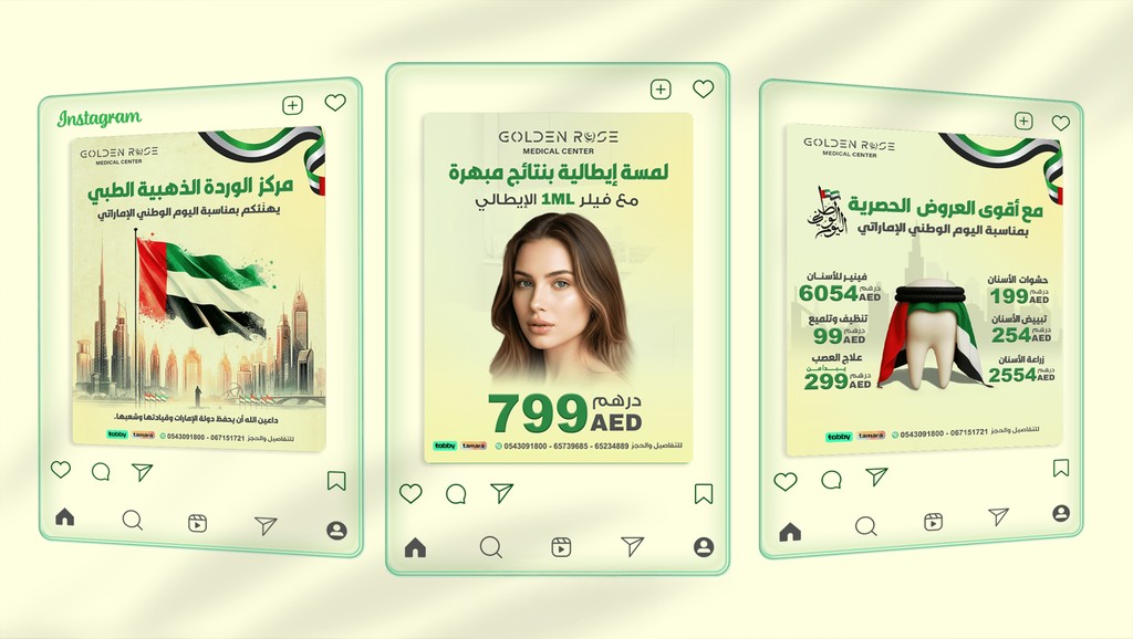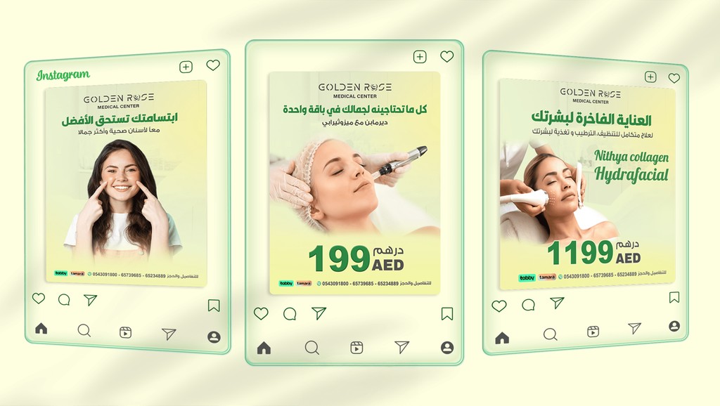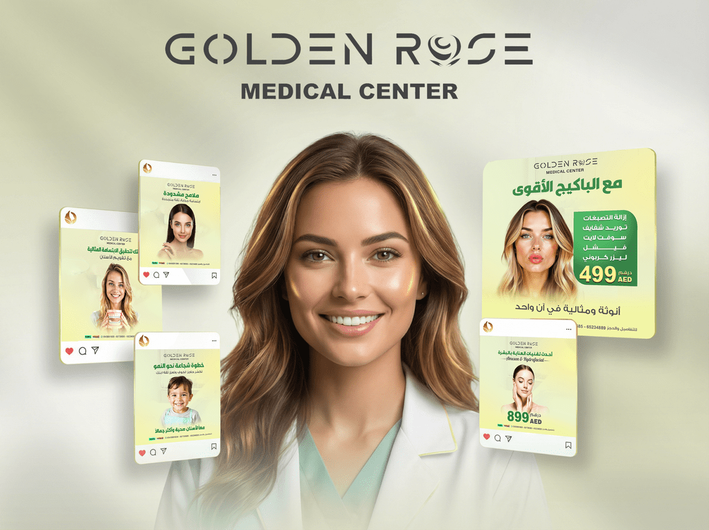 تصميم محتوى بصري احترافي لمنصات التواصل الاجتماعي يعكس الطابع الطبي الراقي للعيادة ويبرز خدماتها التجميلية بشكل جذاب.