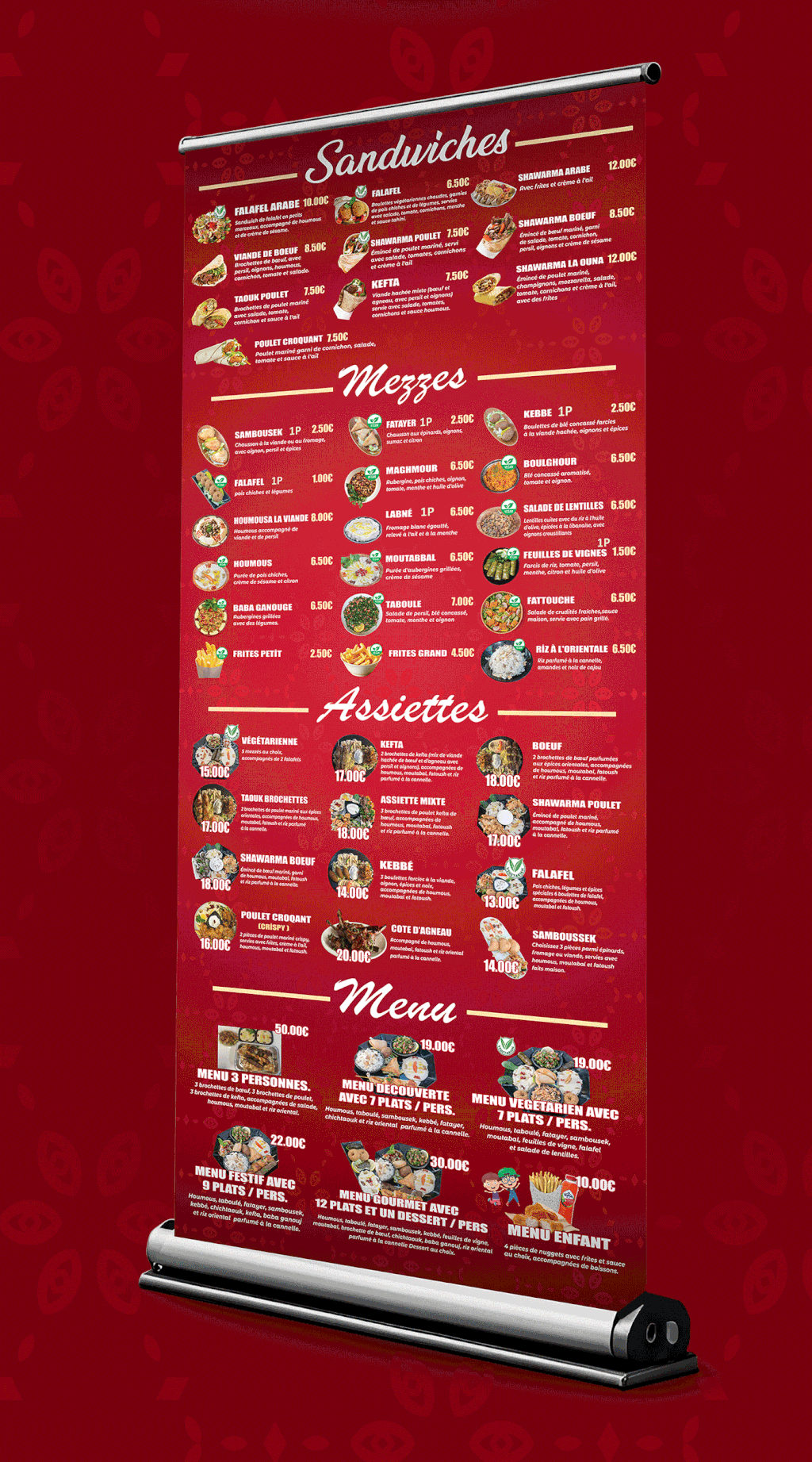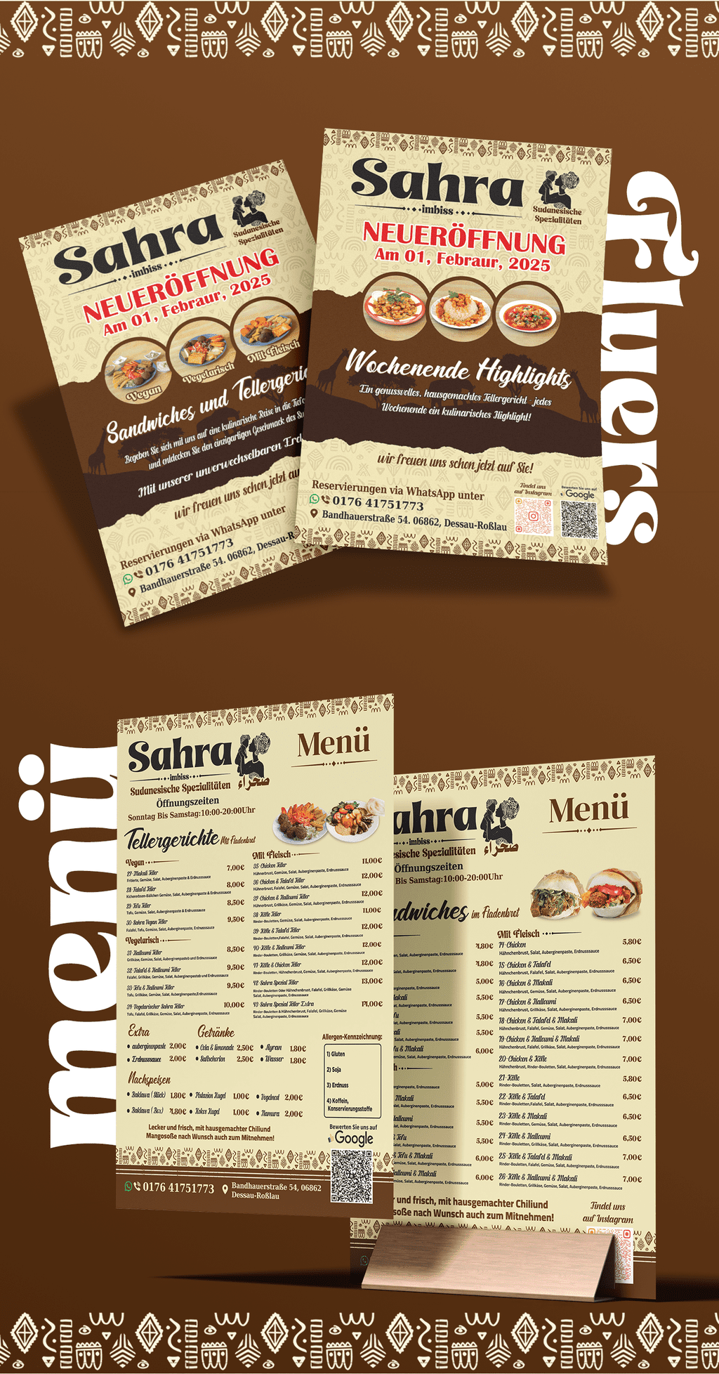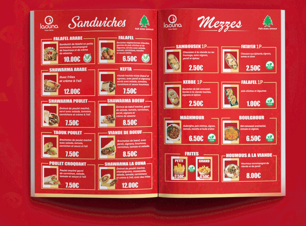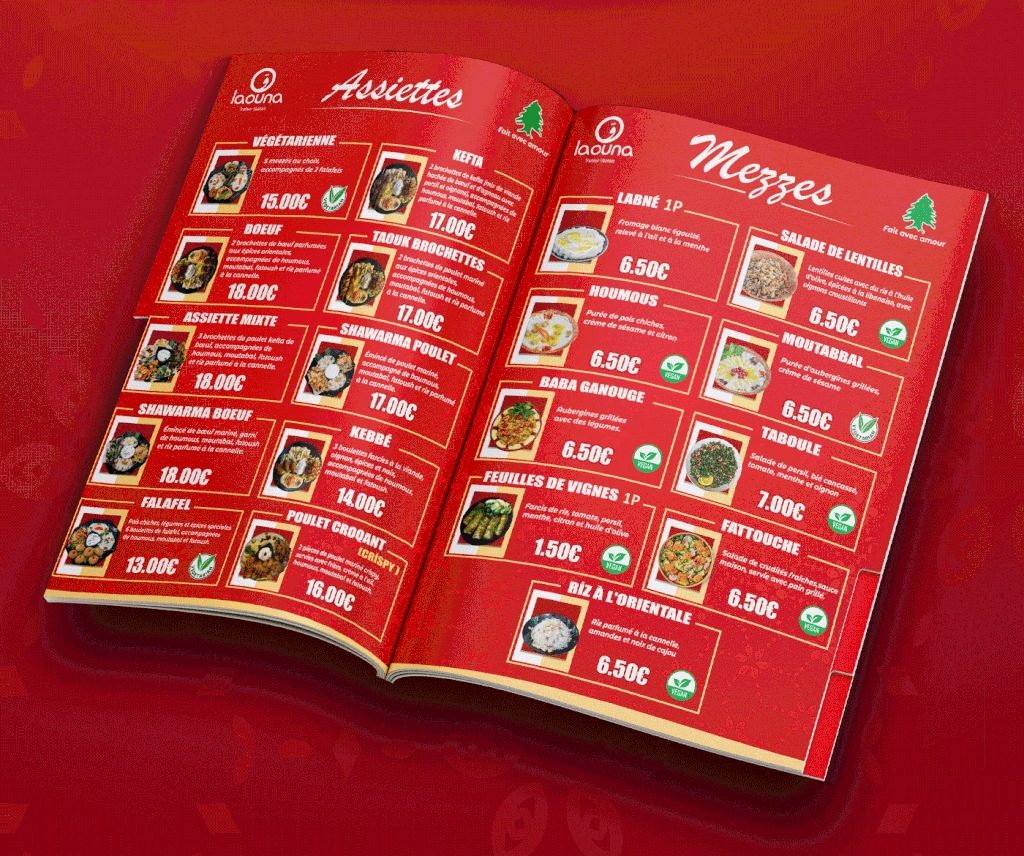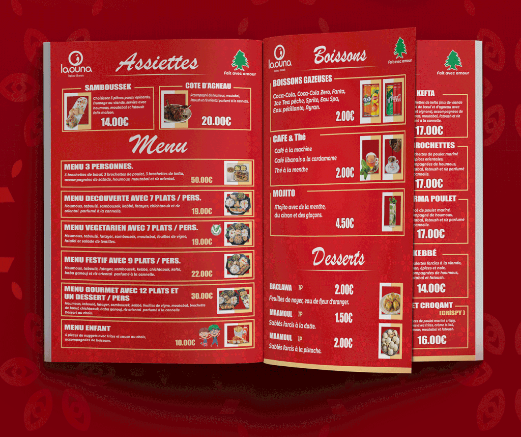 * تصميم وتنفيذ قوائم طعام (منيوهات) للمطاعم إلى جانب اللوحات الإعلانية، مع التركيز على إبراز الهوية البصرية وجذب انتباه العملاء.