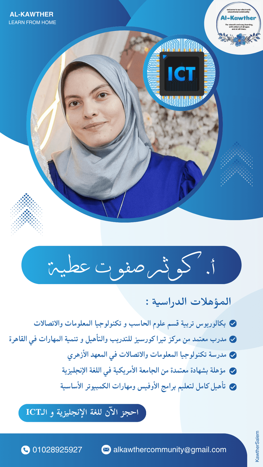 تجربة تعليمية في المدارس الابتدائية والمتوسطة، حيث قمت بتدريس المهارات التقنية والبرمجية، وتقديم محتوى تعليمي واضح وعملي للطلاب، مع تطوير مهارات التواصل والقدرة على شرح المفاهيم المعقدة ببساطة.