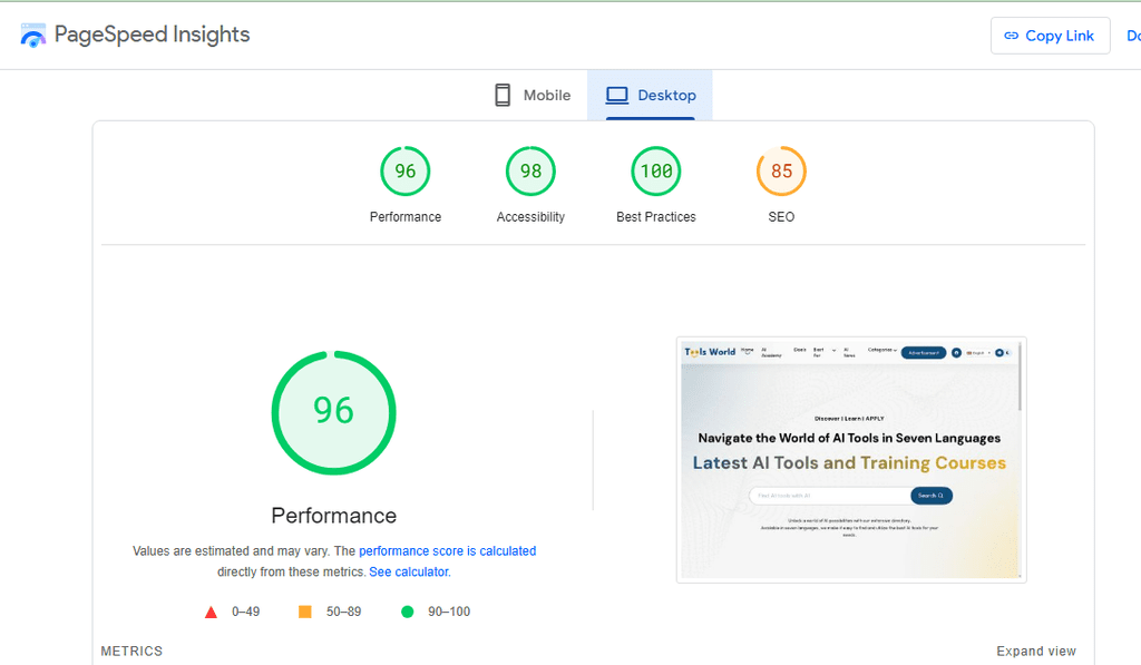 • تحسين الأداء التقني للموقع ورفع سرعة النسخة المكتبية إلى 100/100 على Google PageSpeed Insights.