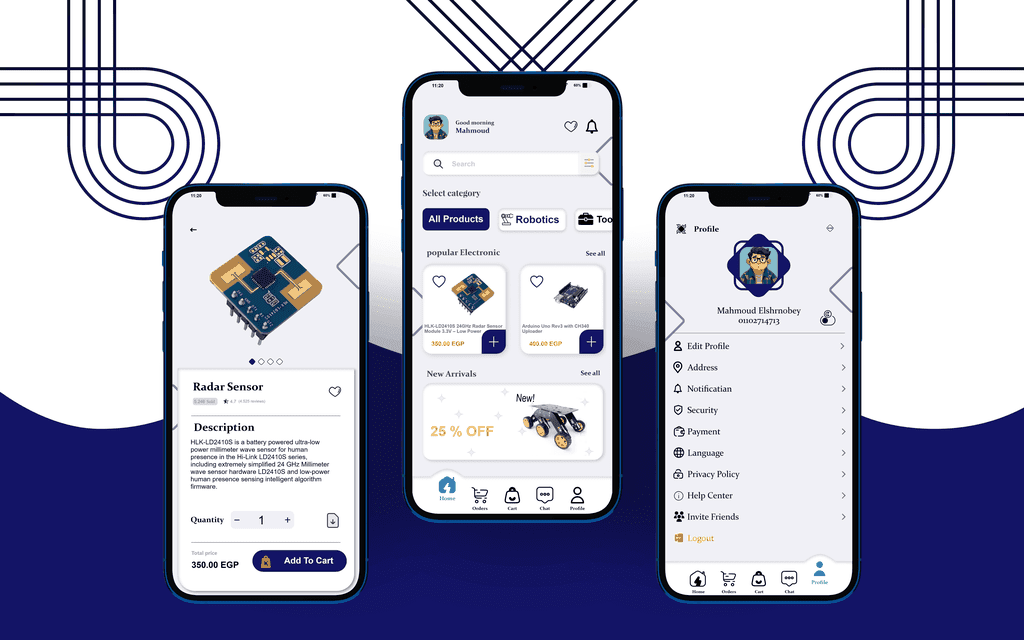 ElektroMarket: تطبيق متخصص في بيع الأدوات والمكونات الإلكترونية، صممت له تجربة مستخدم سلسة تسهّل عملية الشراء.