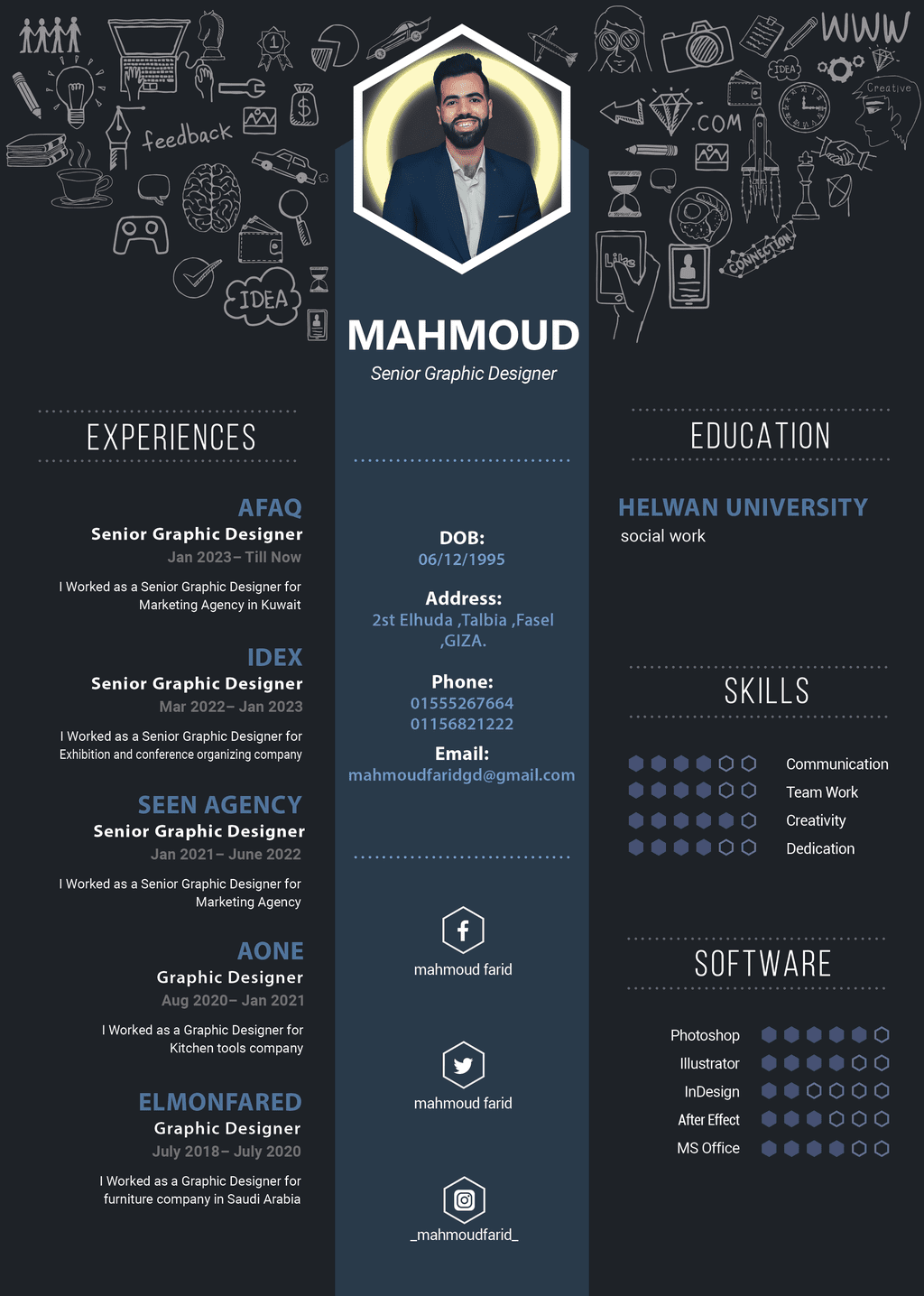 أنا مصمم جرافيك بخبرة تتجاوز 7 سنوات في وكالات تسويق وشركات متعددة المجالات (المعارض والمؤاتمرات، الأثاث، الأدوات المنزلية، التسويق الرقمي).