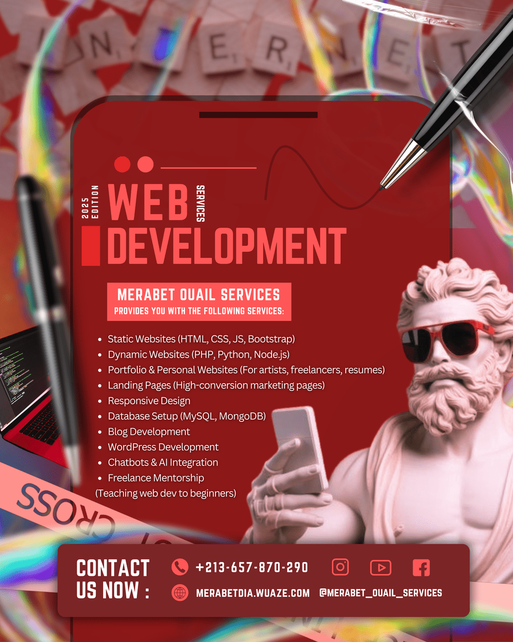 أنا مرابط وائل ضياء الدين، مهندس برمجيات حاصل على ماستر في علوم الحاسوب (تخصص هندسة نظم معلوماتية وأمن). أملك خبرة واسعة في خدمة العملاء، الدعم الفني، قيادة الفرق، التدريب، وتطوير الويب، إضافةً إلى خبرتي في التصميم الغرافيكي ومونتاج الفيديوهات القصيرة. عملت في شركات دولية مثل Inter Trade حيث قدّمت الدعم وأدرت فرق العمل، وكذلك في Maroua Shopping حيث أشرفت على التدريب وإدارة الفرق وتنظيم المؤتمرات. إلى جانب ذلك، قدت بنجاح مؤسستين ناشئتين، ما عزز مهاراتي في الإدارة، التنظيم، وصناعة الاستراتيجيات. أتقن تقنيات تطوير المواقع مثل React.js, Node.js, PHP, MySQL, WordPress، كما أتقن التصميم الجرافيجي و تصميم منشورات مواقع التواصل الاجتماعي بالاستعمال ال Canva , CapCut,PhotoShop,Illustrator .أسعى دائمًا لتوظيف خبرتي التقنية والإبداعية في تحقيق أفضل النتائج والمساهمة في نمو أي مشروع أعمل عليه.