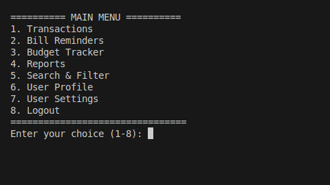 قمت بتطوير تطبيق متكامل لإدارة الشؤون المالية الشخصية باستخدام لغة Python، وهو تطبيق يعتمد على الواجهة النصية (Console-based Application).
