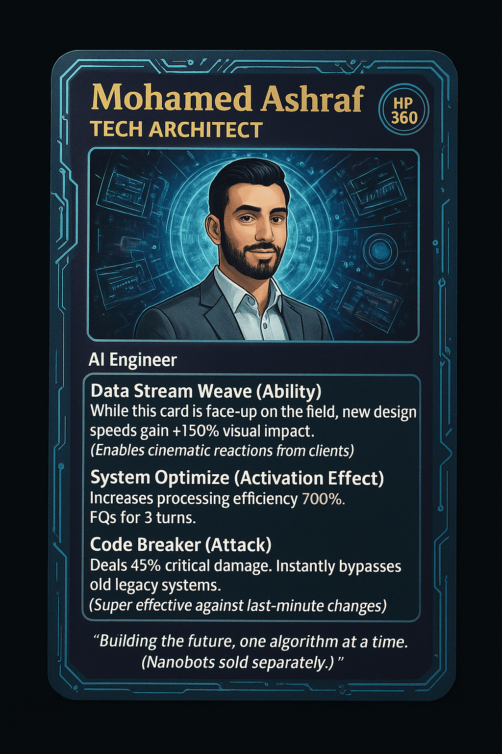 أنا مصمم جرافيك بحب دايمًا أحوّل الأفكار لصور وتفاصيل ملموسة تقدر توصل للناس وتشدّ انتباههم. شغلي مش مجرد شكل جمالي، لكن بحاول يكون ليه معنى وتأثير يوصل الرسالة بوضوح. دراستي في هندسة الميكاترونكس ساعدتني أكتسب دقة وتنظيم في التفكير، وخلتني أبص للتصميم من زاوية مختلفة، زاوية فيها فن وإبداع بس كمان فيها منطق وذكاء. يمكن ده السبب اللي بيخلي أي مشروع بشتغل عليه يكون مزيج ما بين الجمال والوظيفة.