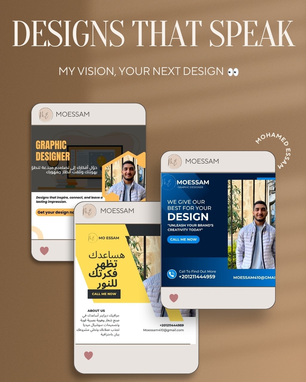أنا مصمم جرافيك محترف أمتلك خبرة في تصميم الشعارات والهويات البصرية وتصاميم السوشيال ميديا والسير الذاتية. أركز على تقديم تصاميم عصرية وجذابة تعكس هوية العملاء وتحقق أهدافهم، مع التزام كامل بالجودة والوقت.
