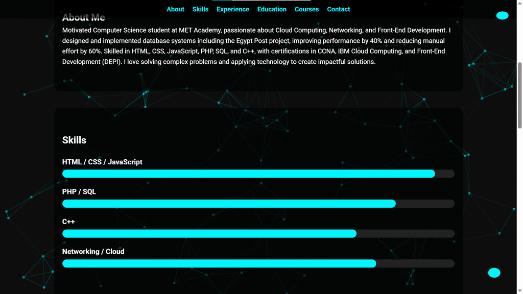 اشتغلت على مشاريع حقيقية زي نظام البريد المصري، وكنت مسؤول عن تصميم قاعدة البيانات وبناء واجهات المستخدم كاملة. دايمًا بحرص على كتابة كود نظيف، قابل للتعديل، ومتماشي مع أفضل الممارسات، وكمان بحب أتعلم أدوات وتقنيات جديدة زي Cloud Computing وFront-End Frameworks.