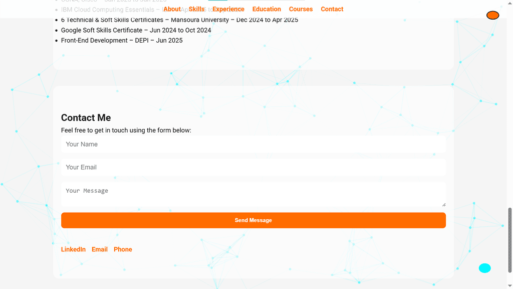 حاصل على شهادات في CCNA، الحوسبة السحابية (IBM & AWS basics)، وبرمجة الويب لتعزيز المهارات العملية والتطبيقية.
