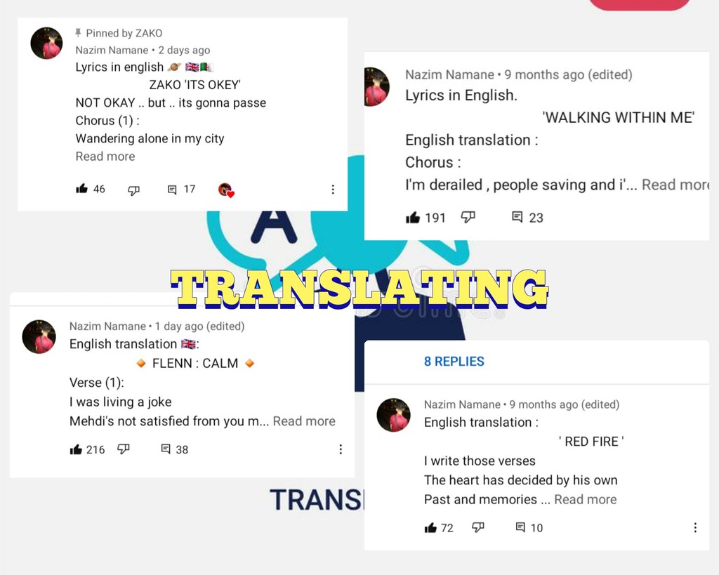 ▪︎ مترجم لعدة اغاني في مختلف مواقع التواصل الاجتماعي و الحياة الواقعية.