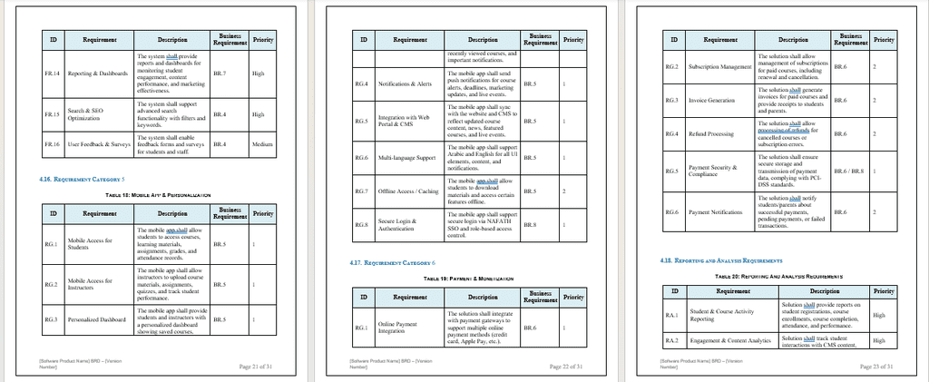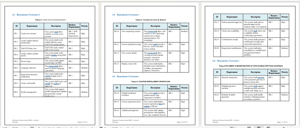 تحليل الأنظمة وكتابة المتطلبات الوظيفية (Functional Requirements).