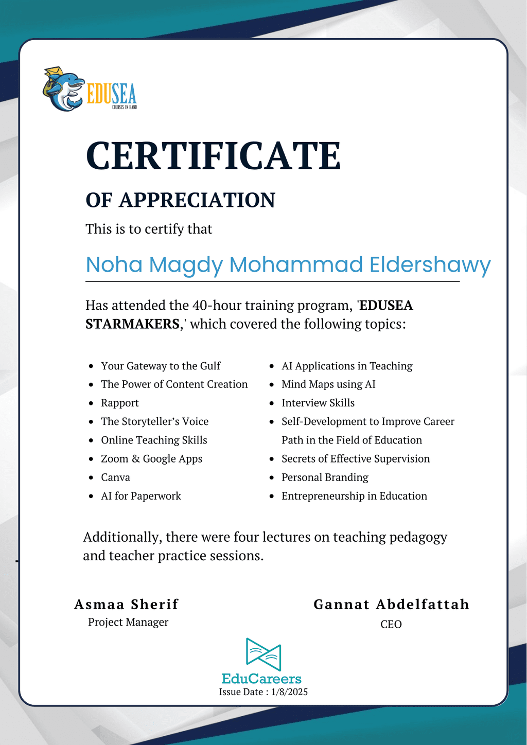 عملت كمعلمة في احدي مدارس الشارقه بدولة الامارات لمدة عامين ن مرحلة رياض الاطفال الي الصف الخامس الابتدائي 2017-2019