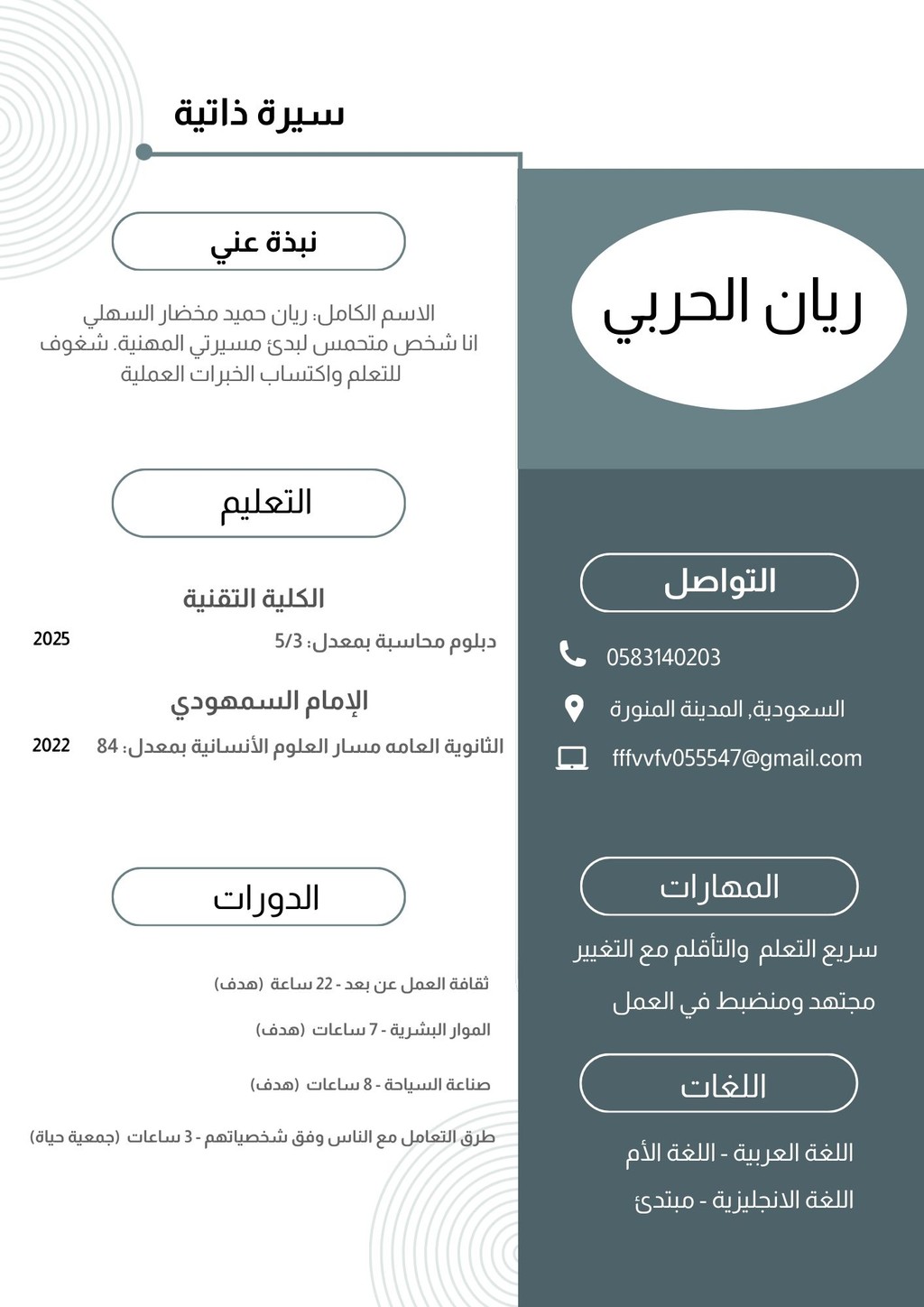 سريع التعلم وقادر على العمل تحت الضغط، ولدي مهارة في خدمة العملاء وتقديم الدعم المناسب. أسعى للحصول على فرصة وظيفية مستقرة أطور من خلالها مهاراتي العملية وأبني مسارًا مهنيًا ناجحًا