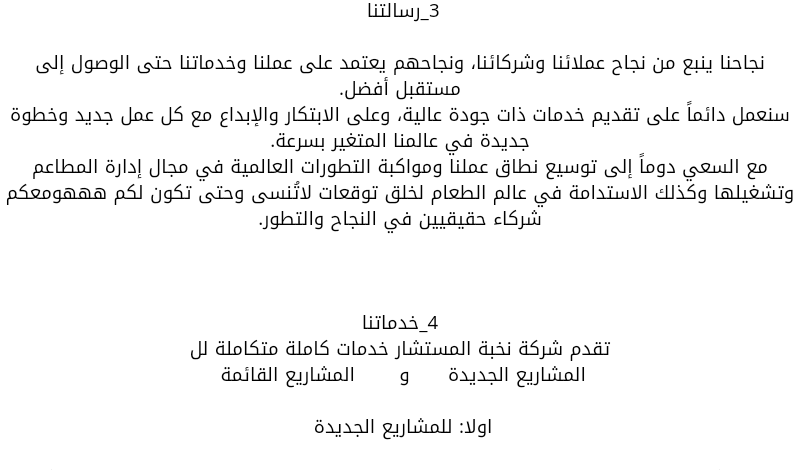 _إذا كنت تريد الاستفسار عن خدماتي أو خدمة ليست موجودة ضمن خدماتي، فلا تتردد في سؤالي وإرسال نماذج لك من أي من الخدمات السابقة.