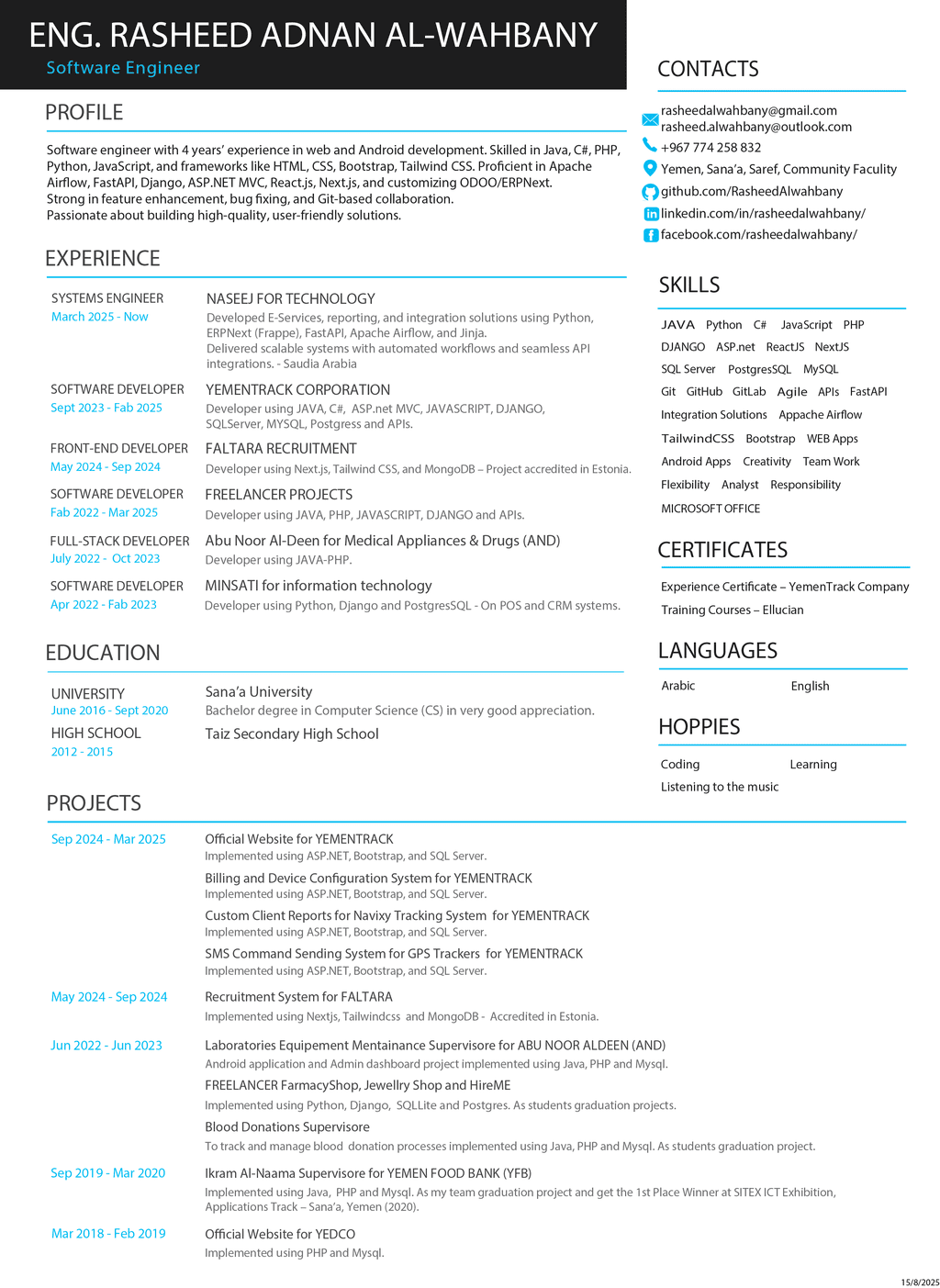 I am a software developer with 4 years of experience in designing and developing websites and Android applications. My expertise spans multiple programming languages, including Java, C#, PHP, Python, and JavaScript, as well as modern design frameworks like XML, HTML, CSS, Bootstrap, and Tailwind CSS.