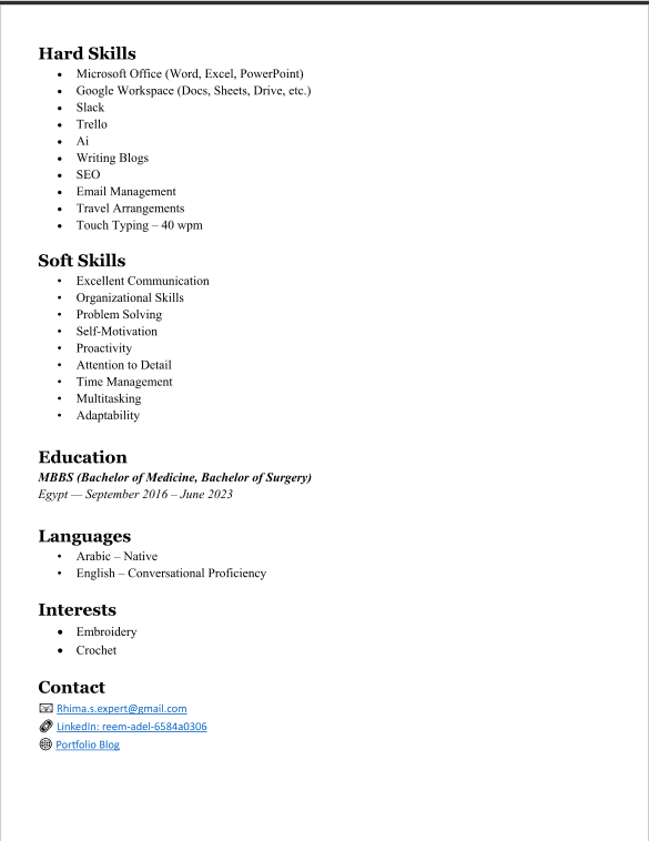 أحترف استخدام برامج ميكروسوفت و برامج جوجل، شغوفة للغاية بالكتابة، وتحليل البيانات عن طريق برنامج أكسيل، وتصميم الجرافيك خاصة العروض التقديمية.