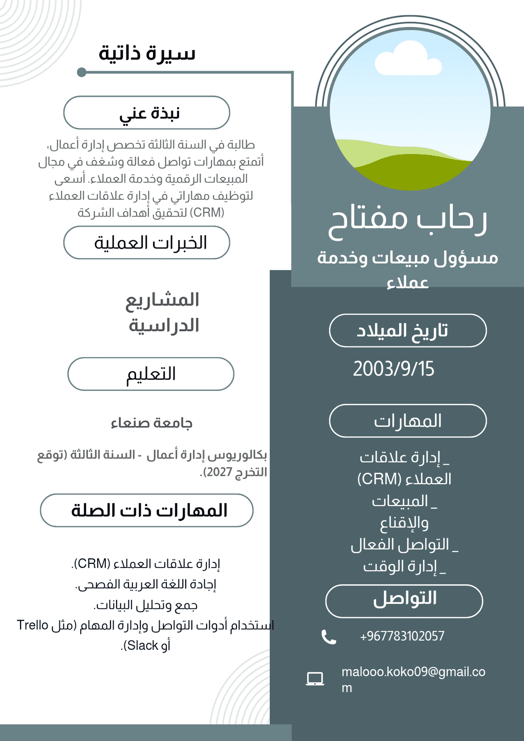 طالبة في السنة الثالثة تخصص إدارة أعمال، أتمتع بمهارات تواصل فعالة وشغف في مجال المبيعات الرقمية وخدمة العملاء. أسعى لتوظيف مهاراتي في إدارة علاقات العملاء (CRM) لتحقيق أهداف الشركة وتقديم تجربة مستخدم متميزة.