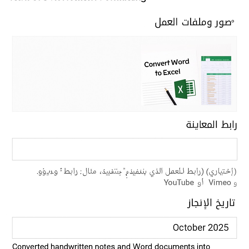 أقدم خدمة إدخال بيانات دقيقة وسريعة من ملفات PDF أو صور أو مستندات إلى Excel أو Google Sheets.