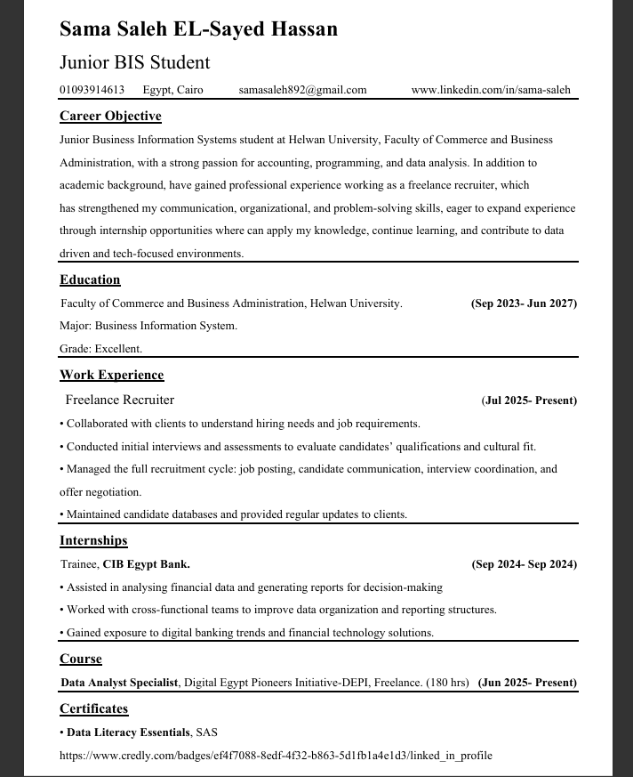 أنا سما صالح محللة بيانات في مبادرة رواد مصر الرقمية(DEPI) التابعة لوزارة الاتصالات و تكنولوجيا المعلومات, شغوفه بتحليل البيانات واستخراج الرؤى اللي بتساعد الشركات على اتخاذ قرارات أذكى وتحقيق نمو فعلي.