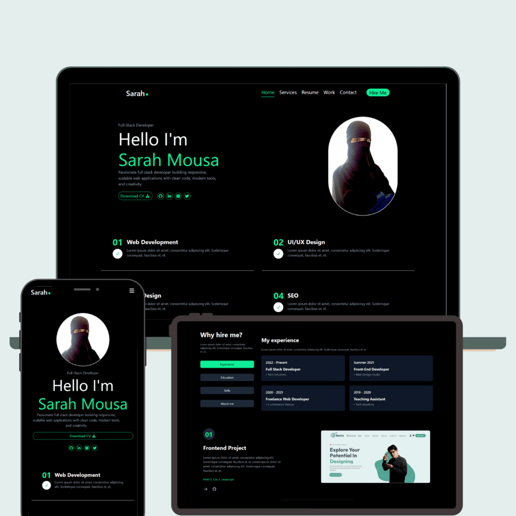 أنا سارة موسى، (Full Stack Developer) أعمل على تطوير مواقع احترافية متجاوبة وسريعة الأداء باستخدام HTML, CSS, JavaScript, PHP, وWordPress.