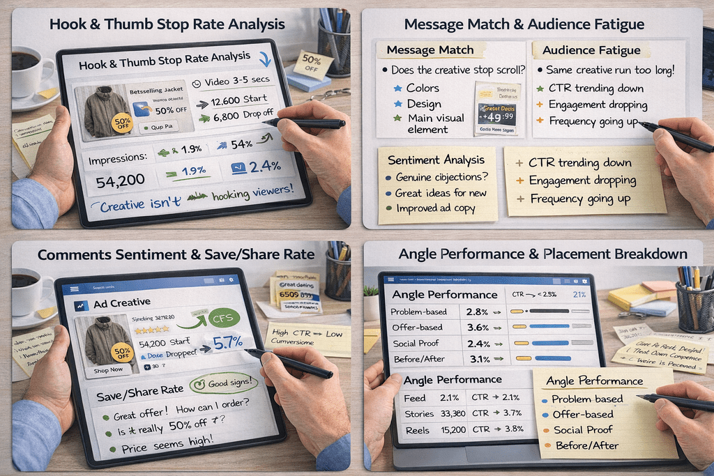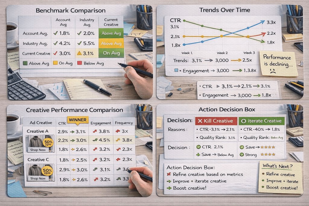 تحليل شامل لأداء الحملات الإعلانية لمعرفة نقاط القوة والضعف، وتحديد أسباب انخفاض النتائج أو ارتفاع التكلفة، مع تقديم توصيات واضحة مبنية على البيانات لتحسين الأداء واتخاذ قرارات صحيحة.