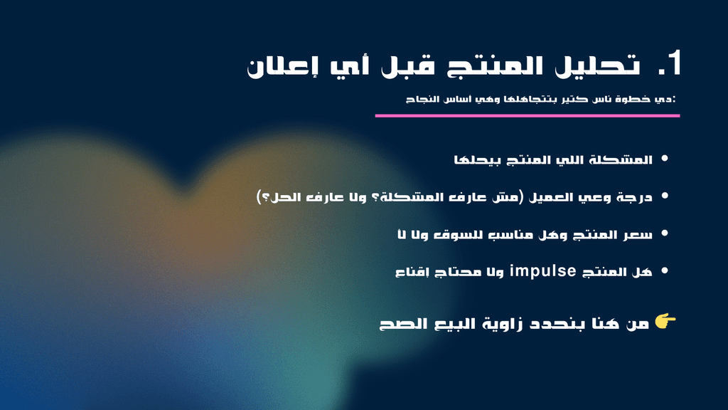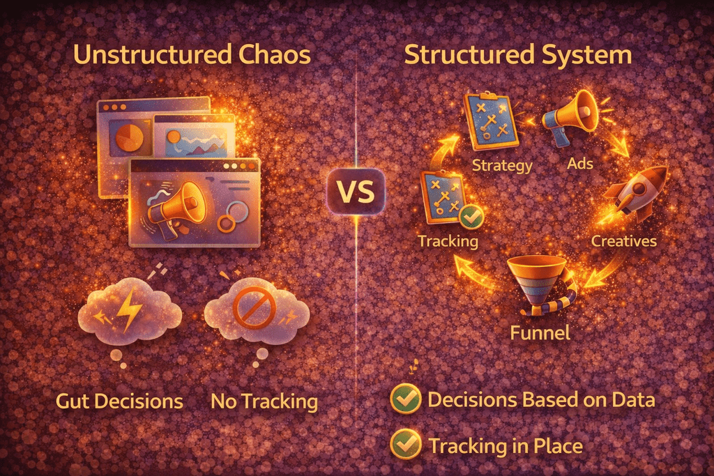 ببني نظام كامل يبدأ من التحليل، يمر بالإعلانات والكرياتيف، يوصل للفانل والتتبع، وينتهي بقرارات توسّع مدروسة.