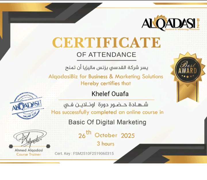 ساركت في عدة دورات للتسويق الرقمي و اعمل في ادارة صفحات سوشل ميديا و تصميم غرافيكي باستعمال كانفا