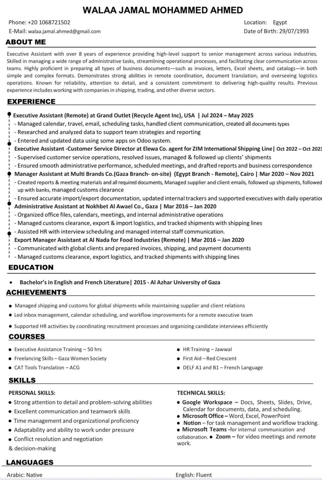 مساعدة تنفيذية بخبرة تتجاوز 8 سنوات في دعم الإدارة العليا وإدارة العمليات المكتبية محليًا وعن بُعد. متمكنة في تنظيم الجداول، تنسيق المراسلات، إعداد الوثائق، ومتابعة الشحنات والخدمات اللوجستية، مع مهارات قوية في التواصل وإدارة المهام بكفاءة عالية