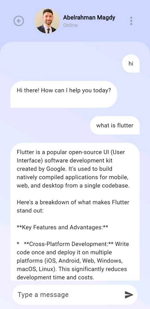 مطور Flutter بخبرة في تطوير تطبيقات الهواتف لنظامي Android وiOS. أمتلك مهارات قوية في تصميم واجهات المستخدم وربط التطبيقات بـ APIs خارجية، وأسعى دائمًا لتقديم حلول برمجية عالية الجودة. لدي شغف بالتعلم المستمر ومتابعة أحدث تقنيات البرمجة.